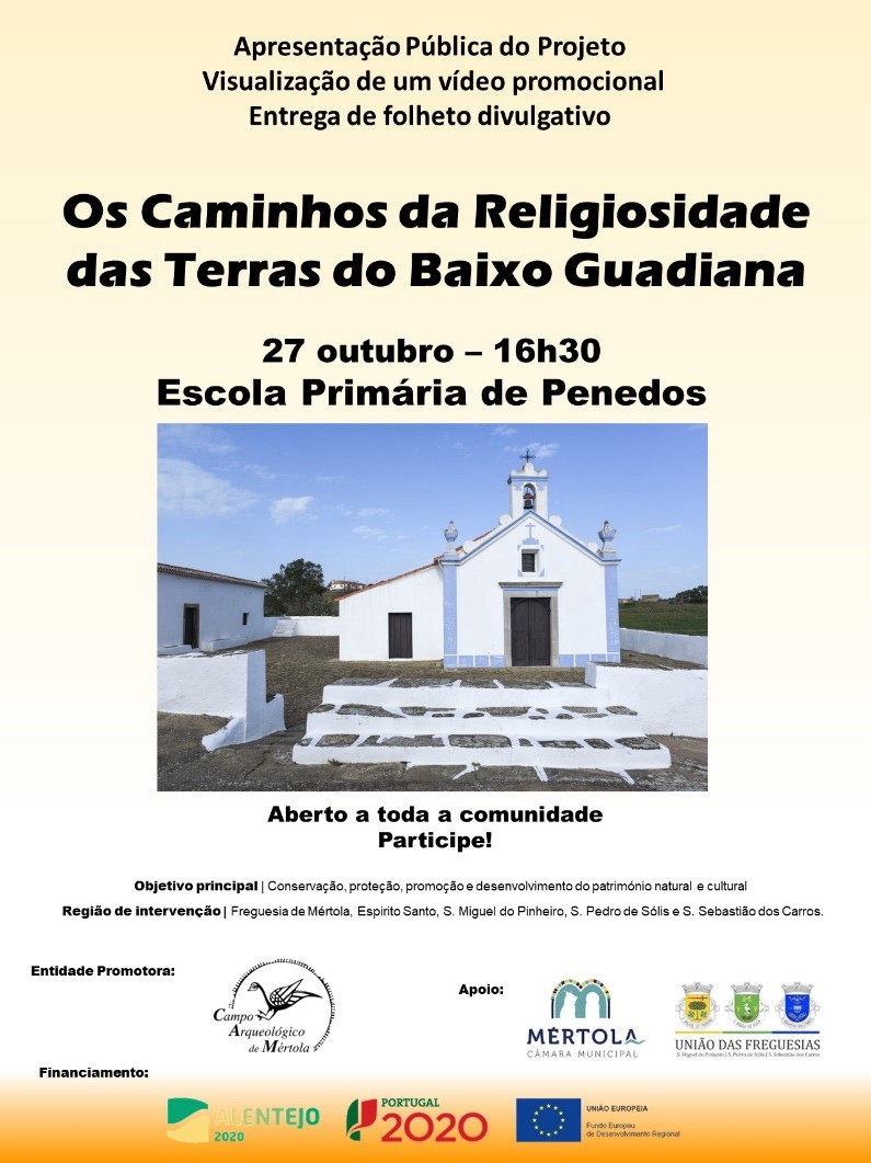 Dia 27 de outubro, pelas 16h30, na Escola Primária de Penedos será apresentado o Projeto "Caminhos da Religiosidade das Terras do Baixo Guadiana", dedicado a promover desde um ponto de vista turístico a Religiosidade Popular do Concelho de Mértola, em geral e da União de Freguesias de São Miguel do Pinheiro, São Sebastião dos Carros e São Pedro de Sólis em particular.