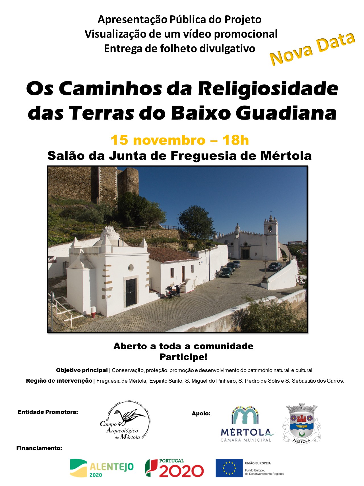 Dia 15 de novembro, pelas 18h00, no Salão da Junta de Freguesia de Mértola, será apresentado o Projeto "Caminhos da Religiosidade das Terras do Baixo Guadiana” dedicado a promover desde um ponto de vista turístico a Religiosidade Popular do Concelho de Mértola, em geral e das Freguesias de Mértola, Espírito Santo e União de Freguesias de São Miguel do Pinheiro, São Sebastião dos Carros e São Pedro de Solis em particular.