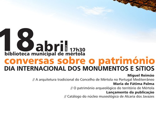 Nas comemorações do Dia Internacional dos Monumentos e Sítios, 18 de Abril de 2013, pelas pelas 17h.30m, na Biblioteca Municipal de Mértola, irá realizar-se a sessão “Conversas sobre o património”, organização da Câmara Municipal de Mértola e Campo Arqueológico de Mértola.