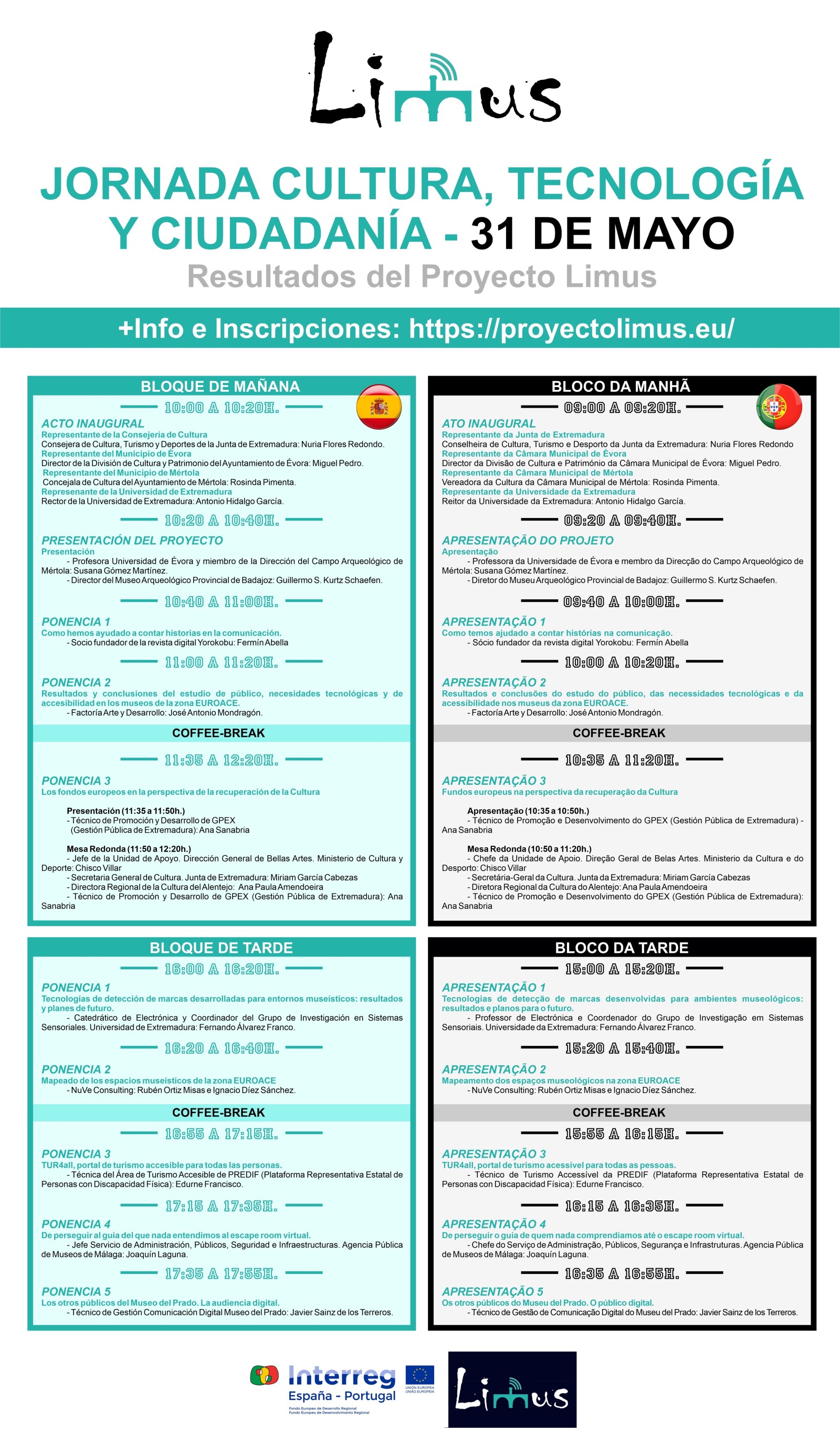 Seminário de encerramento do projeto LIMUS 31, maio 2021 Jornada Cultura, Tecnologia e Cidadania, 31 de Maio de 2021 Mais informação e inscrições em https://proyectolimus.eu/# Anexos Limus-31maio.jpg Termos relacionados: Notícias