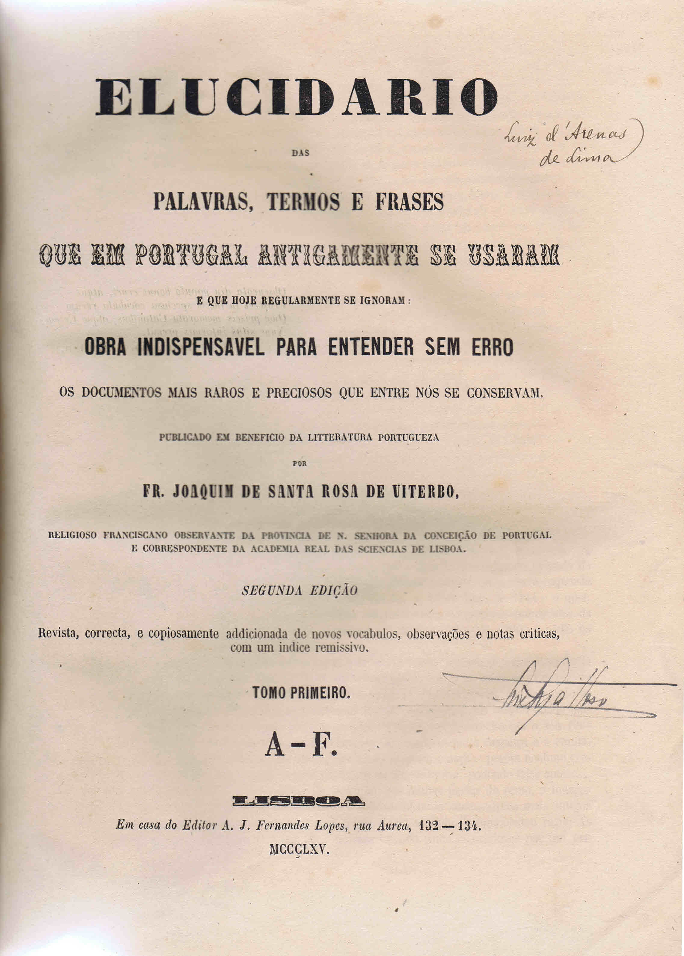 VITERBO, Joaquim de Santa Rosa de - Elucidário das palavras, termos e frases que em Portugal antigamente se usaram e que hoje regularmente se ignoram: obra indispensável para entender sem erro os documentos mais raros e preciosos que entre nós se conservam. 2ª ed. revista, correcta e copiosamente addicionada de novos vocábulos, observações e notas críticas com um índice remissivo. Lisboa: A. J. Fernandes Lopes, 1365 [i.é 1865]. vols.