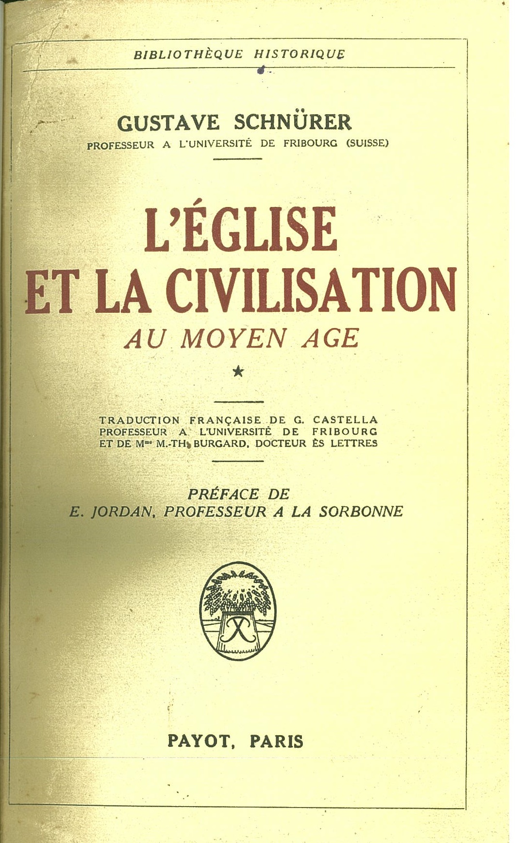 SCHNÜRER, Gustav - L'Église et la civilisation au Moyen age. Paris : Payot, 1933-1938. 3 vols.