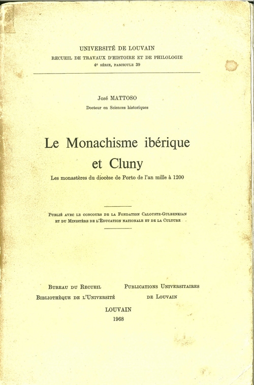 MATTOSO, José - Le monachisme ibérique et Cluny: les monastères du diocèse de Porto de l'an mille à 1200. Louvain: Publications Universitaires de Louvain, 1968. XIX, 436 p. Apresentada inicialmente como tese de doutoramento do autor, Universidade de Lovaina (Bélgica), 1966.