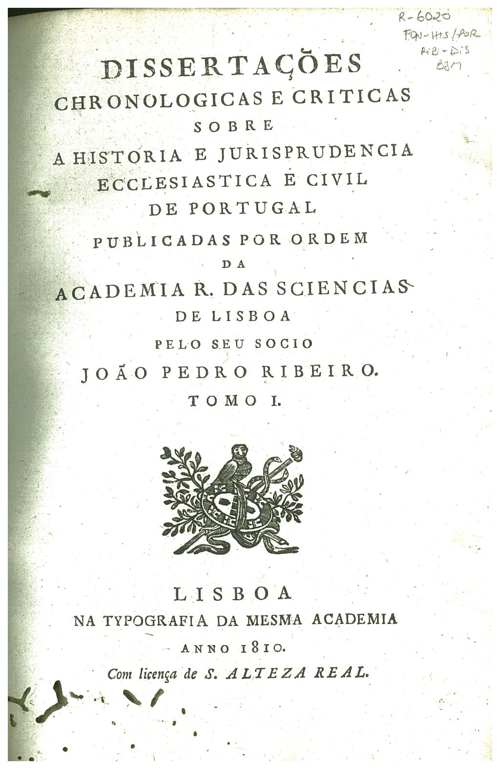 RIBEIRO, João Pedro - Dissertações chronologicas e criticas sobre a historia e jurisprudencia eclesiastica e civil de Portugal. Lisboa : Academia Real das Ciências, 1810-1836. 5 tomos em 7 vol.