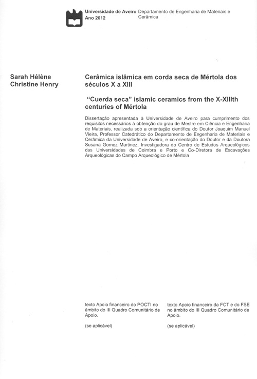 HENRY, Sarah Hélène Christine - Cerâmica islâmica em corda seca de Mértola dos séculos X a XIII = “Cuerda seca” Islamic ceramics from the X-XIIIth centuries of Mértola. Aveiro: [s.n.], 2012. Master’s dissertation on Materials Science and Engineering presented to the University of Aveiro. Supervised by Joaquim Manuel Vieira and co-supervised by Susana Goméz Martínez.