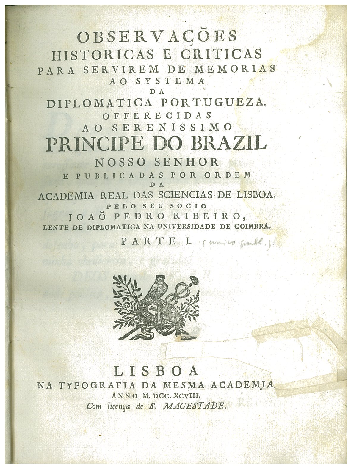 RIBEIRO, João Pedro - Observações historicas e criticas para servirem de memorias ao systema da diplomatica portugueza. Lisboa : na Typografia da mesma Academia, 1798. 152, [4] p.